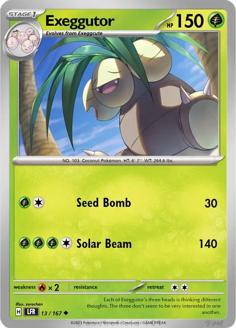 Each of Exeggutor’s three heads is thinking different thoughts. The three don’t seem to be very interested in one another.