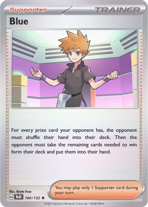 For every prize card your opponent has, the opponent must shuffle their hand into their deck. Then the opponent must take the remaining cards needed to win form their deck and put them into their hand.