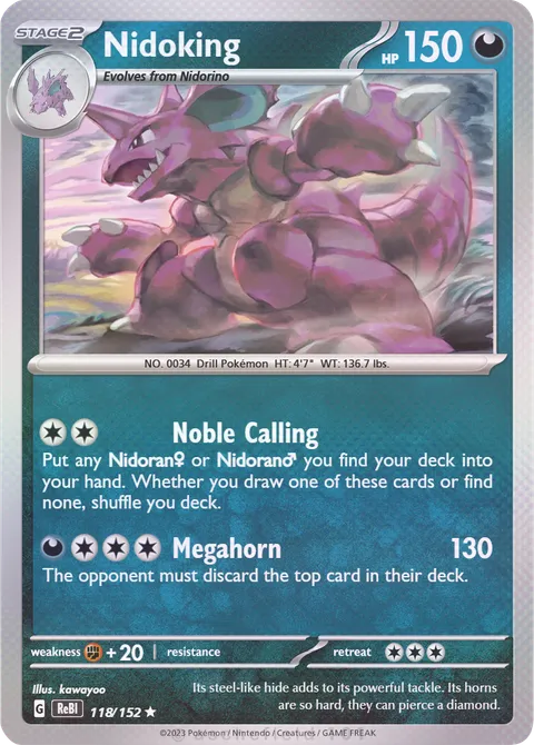 NO. 0034 Drill Pokémon HT: 4'7" WT: 136.7 lbs.illus. kawayoo#118/152 Its steel-like hide adds to its powerful tackle. Its horns are so hard, they can pierce a diamond.Created by @MylesGamin on 02 December 2025