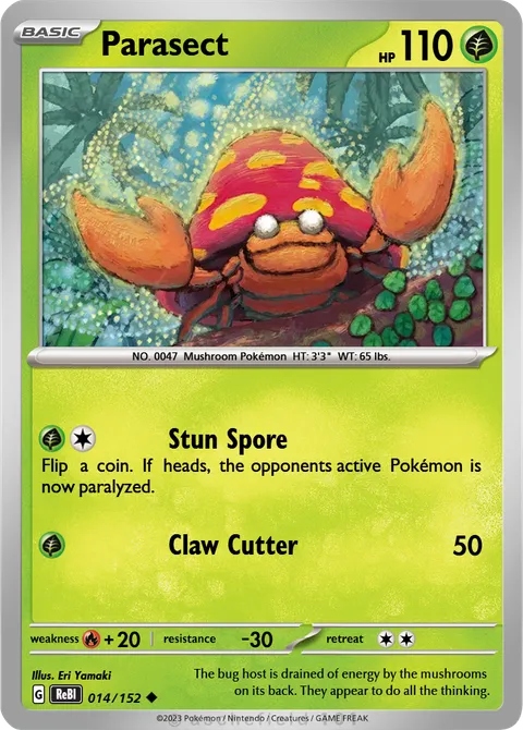 NO. 0047 Mushroom Pokémon HT: 3'3" WT: 65 lbs.illus. Eri Yamaki#014/152The bug host is drained of energy by the mushrooms on its back. They appear to do all the thinking.Created by @MylesGamin on 05 October 2025