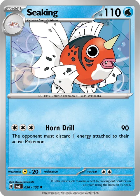 NO. 0119 Goldfish Pokémon HT: 4'3" WT: 86 lbs.illus. Kyoko Umemoto#056/152It is the male’s job to make a nest by carving out boulders in a stream using the horn on its head.Created by @MylesGamin on 14 October 2025