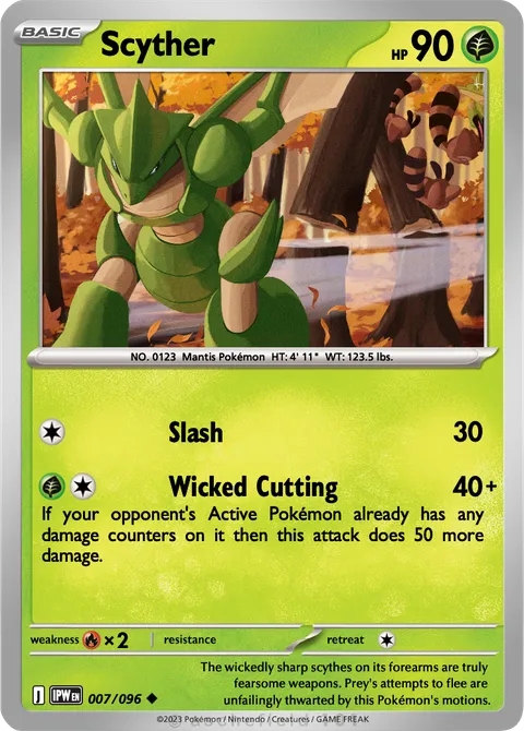 NO. 0123 Mantis Pokémon HT: 4' 11" WT: 123.5 lbs.#007/096The wickedly sharp scythes on its forearms are truly fearsome weapons. Prey's attempts to flee are unfailingly thwarted by this Pokémon's motions.Created by @MythicFox009 on 21 March 2026, last edited on 21 March 2026