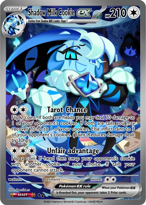 Flip 2 coins. If both are heads you may deal 70 damage to 1 of your opponent's cookies. If both are tails you may recover 70 hp to 1 of your cookies. Else inflict taint to 3 of your opponent's cookies. (Taint: Reduces damage dealt by 30hp)