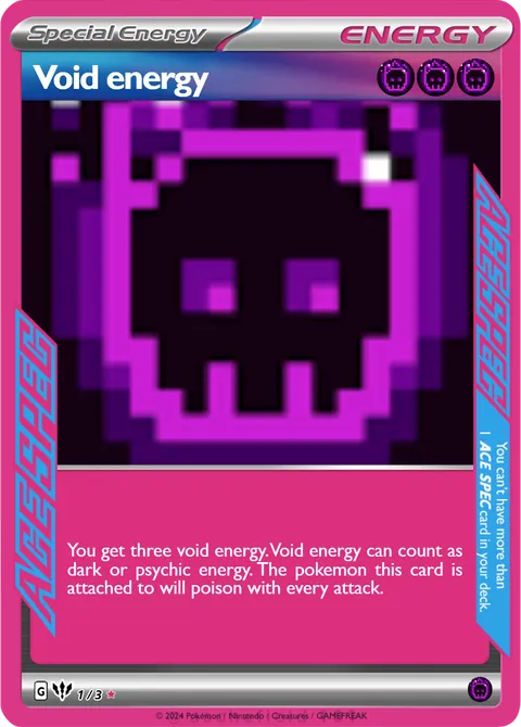 You get three void energy. Void energy can count as dark or psychic energy. The pokemon this card is attached to will poison with every attack.