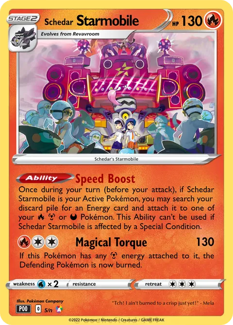 discard pile for an Energy card and attach it to one of your RM or D Pokémon. This Ability can’t be used if Schedar Starmobile is affected by a Special Condition.
