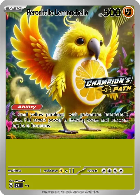 A small yellow parakeet with poisonous lemonchello juice. His attack power is looking sweet and innocent but he is ferocious.Weakness:None