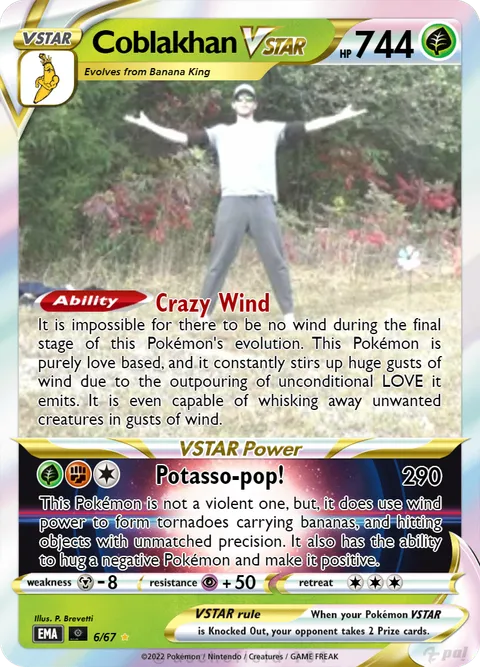 It is impossible for there to be no wind during the final stage of this Pokémon's evolution. This Pokémon is purely love based, and it constantly stirs up huge gusts of wind due to the outpouring of unconditional LOVE it emits. It is even capable of whisking away unwanted creatures in gusts of wind.Potasso-pop! • 290