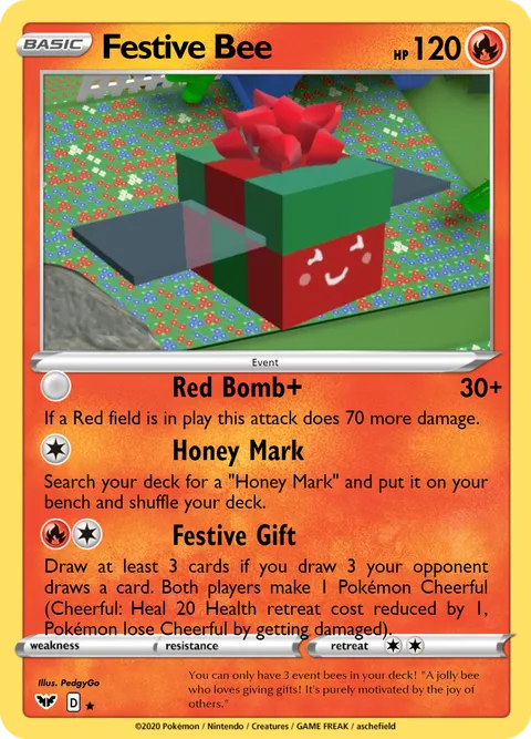 Eventillus. PedgyGoYou can only have 3 event bees in your deck! "A jolly bee who loves giving gifts! It's purely motivated by the joy of others."Created by @Pedgy_Go on 23 November 2023
