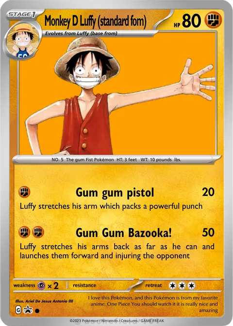 NO. 5 The gum Fist Pokémon HT: 3 feet WT: 10 pounds lbs.illus. Ariel De Jesus Antonio IIIII love this Pokémon, and this Pokémon is from my favorite anime, One Piece You should watch it it is really nice and amazing