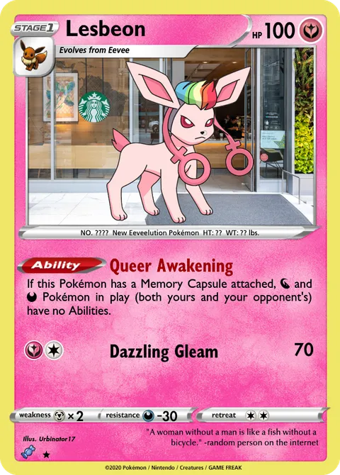NO. ???? New Eeveelution Pokémon HT: ?? WT: ?? lbs.illus. Urbinator17"A woman without a man is like a fish without a bicycle." -random person on the internet
