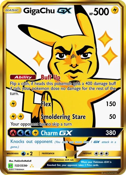 Flip a coin, if heads this pokemon gets a 400 damage buff if tails your pokemon dose no damage for the rest of the turn.