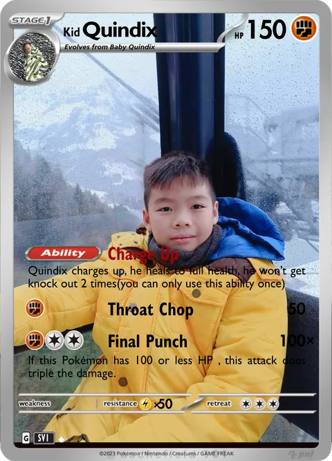 Quindix charges up, he heals to full health, he won’t get knock out 2 times(you can only use this ability once)Throat Chop • 50