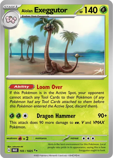 illus. satsume-shi#103/1025Alola is the best environment for this Pokémon. Local people take pride in its appearance, saying this is how Exeggutor ought to look.Created by @PokeNathan on 26 July 2025Includes assets by Creatures Inc.