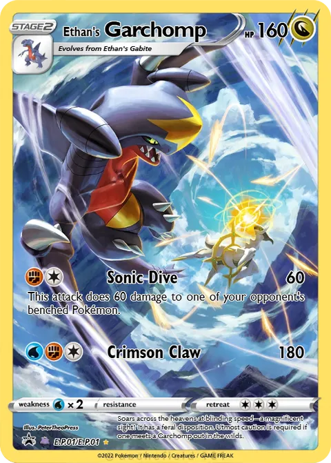 illus. PeterTheoPress#E.P.01/E.P.01Soars across the heavens at blinding speed—a magnificent sight! It has a feral disposition. Utmost caution is required if one meets a Garchomp out in the wilds.Created by @PokePete3 on 30 April 2025Includes assets by Creatures Inc.