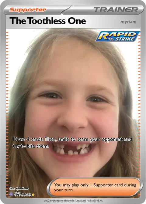 Draw 4 cards. Then, smile to scare your opponent and try to bite them.