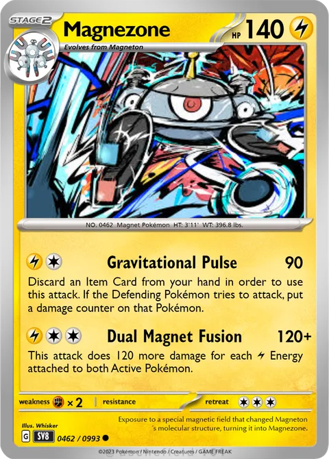 NO. 0462 Magnet Pokémon HT: 3'11' WT: 396.8 lbs.illus. Whisker#0462/0993Exposure to a special magnetic field that changed Magneton´s molecular structure, turning it into Magnezone.Created by @Pokecards on 15 October 2024