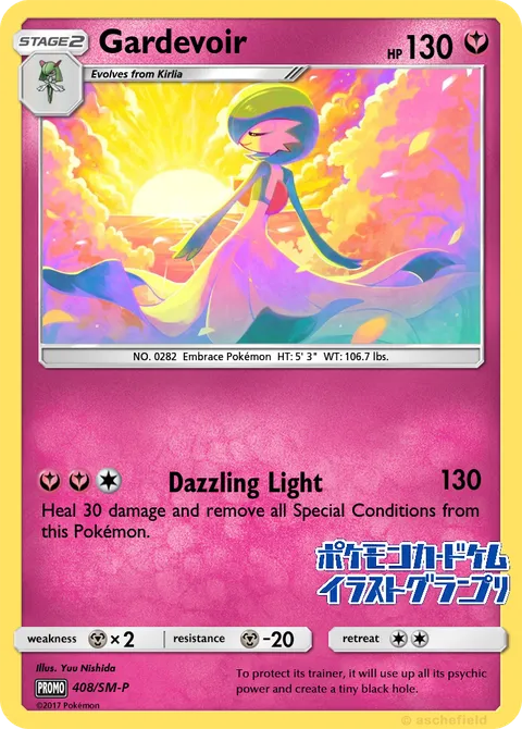 NO. 0282 Embrace Pokémon HT: 5' 3" WT: 106.7 lbs.illus. Yuu Nishida#408/SM-PTo protect its trainer, it will use up all its psychic power and create a tiny black hole.Created by @PokemonAandP on 21 March 2026Includes assets by Creatures Inc.