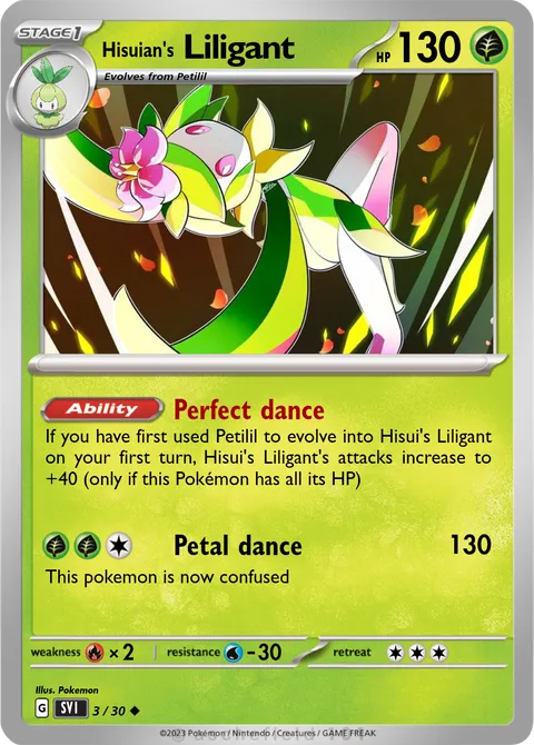 If you have first used Petilil to evolve into Hisui's Liligant on your first turn, Hisui's Liligant's attacks increase to +40 (only if this Pokémon has all its HP)Petal dance • 130