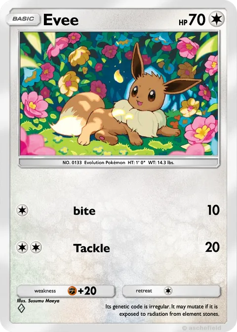 NO. 0133 Evolution Pokémon HT: 1' 0" WT: 14.3 lbs.illus. Susumu MaeyaIts genetic code is irregular. It may mutate if it is exposed to radiation from element stones.Created by @Pokemonmaker2 on 15 January 2026, last edited on 15 January 2026Includes assets by Creatures Inc.