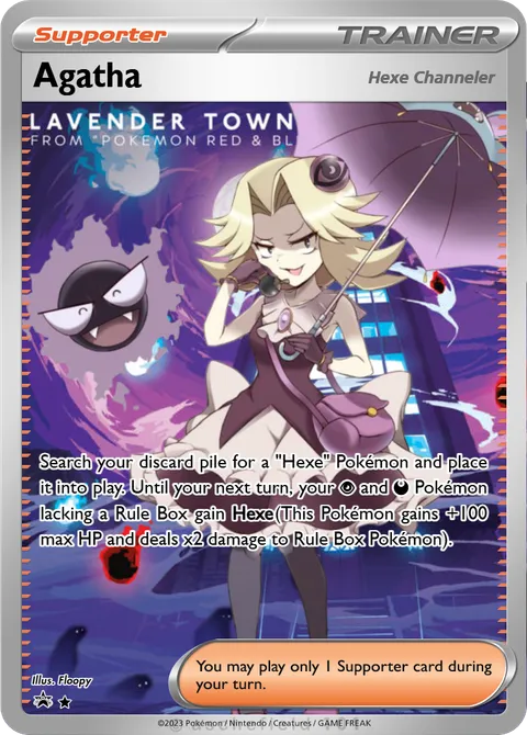 Search your discard pile for a "Hexe" Pokémon and place it into play. Until your next turn, your P and D Pokémon lacking a Rule Box gain Hexe(This Pokémon gains +100 max HP and deals x2 damage to Rule Box Pokémon).