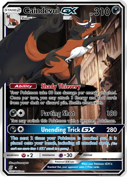 Your Pokémon take 80 less damage per energy attached. Once per turn, you may attach 3 Energy and Tool cards from your deck or discard pile. Shuffle afterwards.Parting Shot • 180