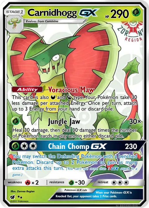 This card is also D and N type. Your Pokémon take 30 less damage per attached Energy. Once per turn, attach up to 3 Energy from your hand or discard pile.Jungle Jaw • 30×