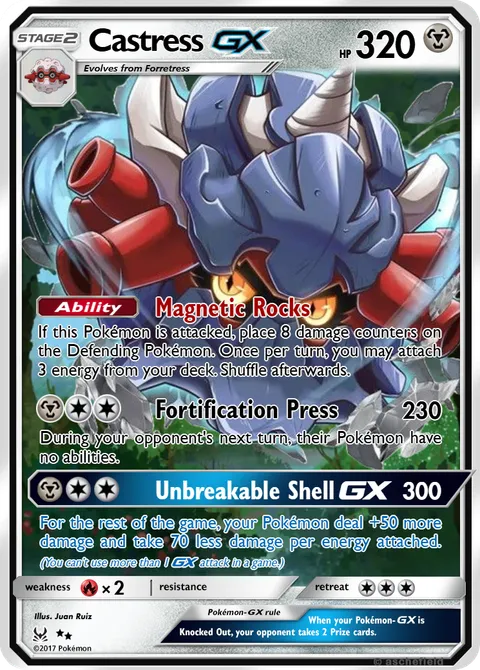 If this Pokémon is attacked, place 8 damage counters on the Defending Pokémon. Once per turn, you may attach 3 energy from your deck. Shuffle afterwards.Fortification Press • 230