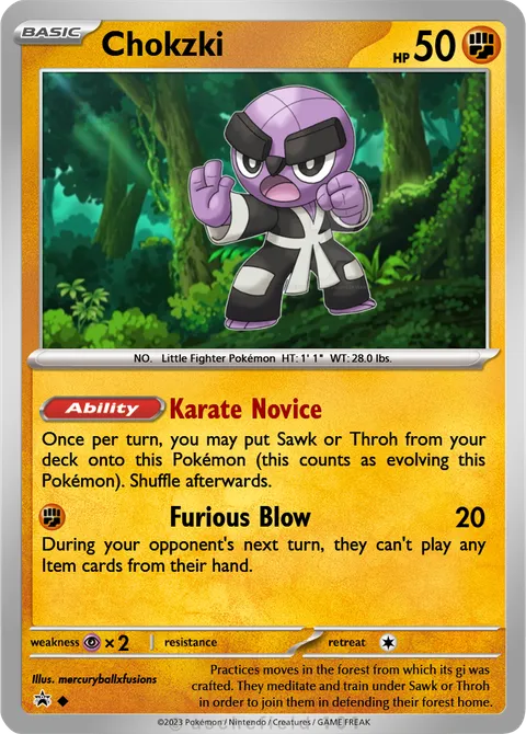 Once per turn, you may put Sawk or Throh from your deck onto this Pokémon (this counts as evolving this Pokémon). Shuffle afterwards.Furious Blow • 20