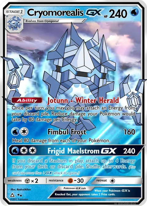 Once per turn, you may you may attach an Energy from your discard pile. Reduce damage your Pokémon would take by 80 damage per Energy.Fimbul Frost • 160
