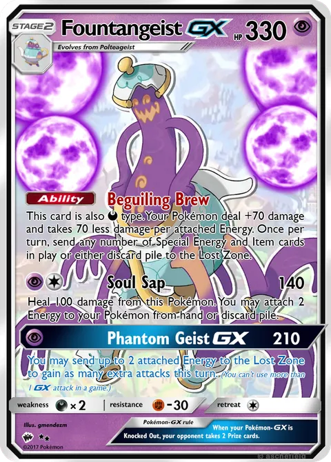 This card is also D type. Your Pokémon deal +70 damage and takes 70 less damage per attached Energy. Once per turn, send any number of Special Energy and Item cards in play or either discard pile to the Lost Zone.Soul Sap • 140