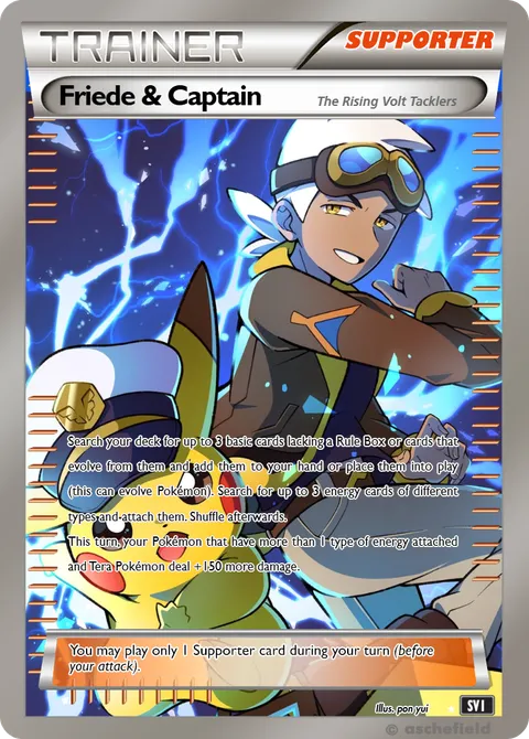 Search your deck for up to 3 basic cards lacking a Rule Box or cards that evolve from them and add them to your hand or place them into play (this can evolve Pokémon). Search for up to 3 energy cards of different types and attach them. Shuffle afterwards. This turn, your Pokémon that have more than 1 type of energy attached and Tera Pokémon deal +150 more damage.