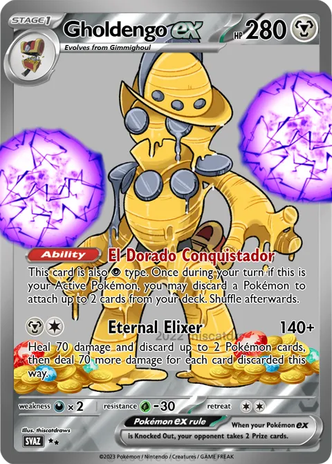 This card is also P type. Once during your turn if this is your Active Pokémon, you may discard a Pokémon to attach up to 2 cards from your deck. Shuffle afterwards.Eternal Elixer • 140+