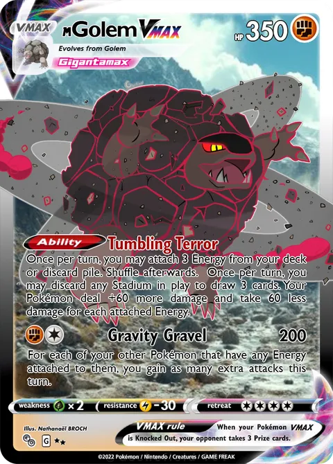 Once per turn, you may attach 3 Energy from your deck or discard pile. Shuffle afterwards. Once per turn, you may discard any Stadium in play to draw 3 cards. Your Pokémon deal +60 more damage and take 60 less damage for each attached Energy.Gravity Gravel • 200+