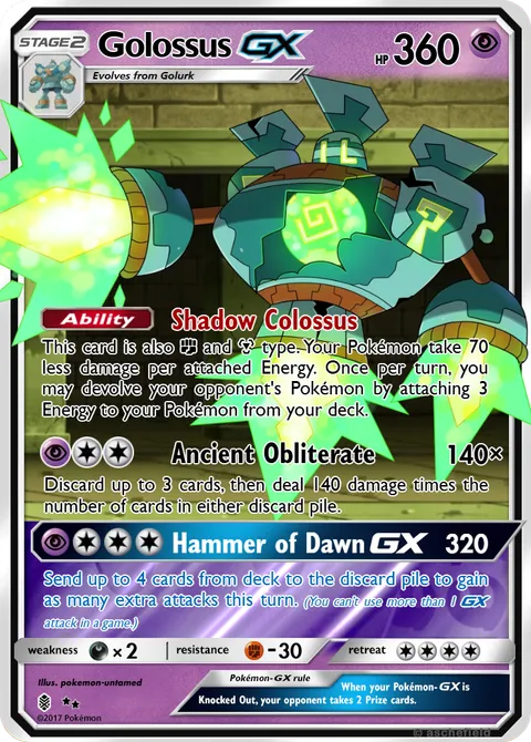 This card is also F and M type. Your Pokémon take 70 less damage per attached Energy. Once per turn, you may devolve your opponent's Pokémon by attaching 3 Energy to your Pokémon from your deck.Ancient Obliterate • 140×