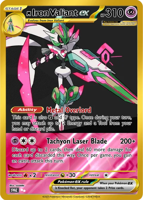 This card is also F and M type. Once during your turn, you may attach up to 2 Energy and a Tool from your hand or discard pile.Tachyon Laser Blade • 200+