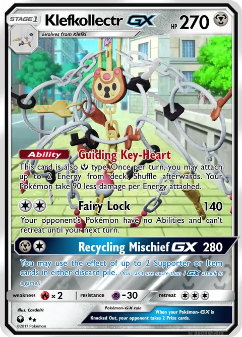 This card is also Y type. Once per turn, you may attach up to 2 Energy from deck. Shuffle afterwards. Your Pokémon take 90 less damage per Energy attached.Fairy Lock • 140