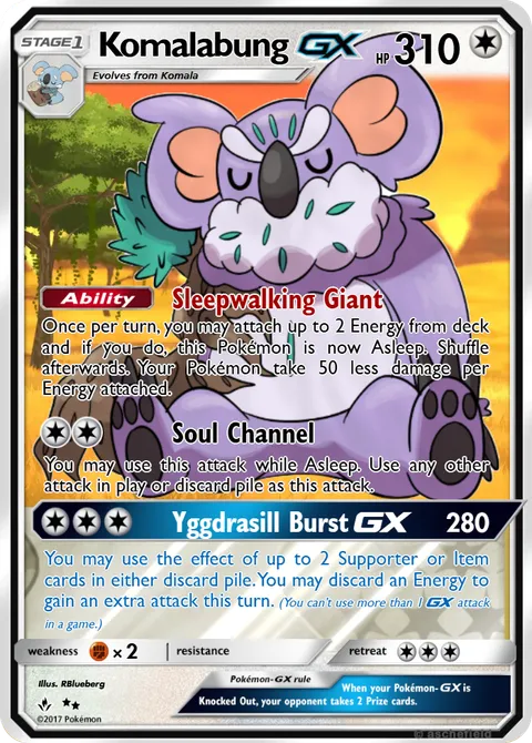 Once per turn, you may attach up to 2 Energy from deck and if you do, this Pokémon is now Asleep. Shuffle afterwards. Your Pokémon take 50 less damage per Energy attached.Soul Channel