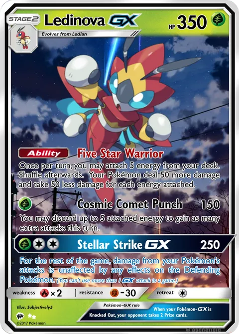 Once per turn, you may attach 5 energy from your deck. Shuffle afterwards. Your Pokémon deal 50 more damage and take 50 less damage for each energy attached.Cosmic Comet Punch • 150