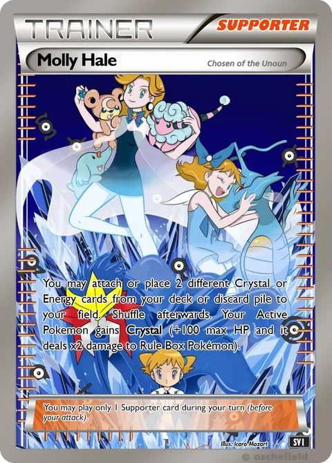 You may attach or place 2 different Crystal or Energy cards from your deck or discard pile to your field. Shuffle afterwards. Your Active Pokemon gains Crystal (+100 max HP and it deals x2 damage to Rule Box Pokémon).