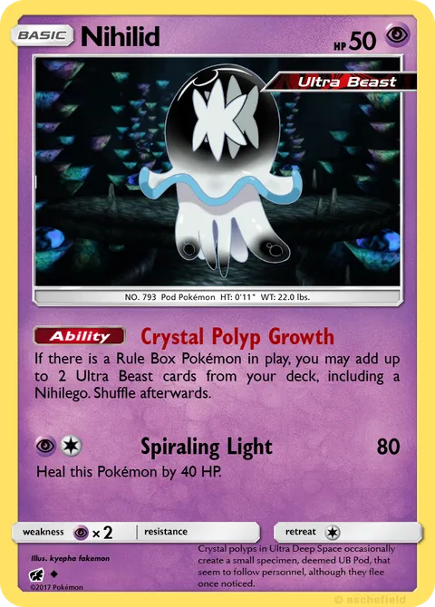 If there is a Rule Box Pokémon in play, you may add up to 2 Ultra Beast cards from your deck, including a Nihilego. Shuffle afterwards.Spiraling Light • 80