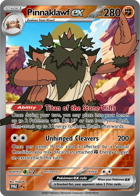 Once during your turn, you may place into your bench up to 2 Pokémon with 130 HP or less from your deck, then attach up to 2 Energy to them. Shuffle afterwards.Unhinged Cleavers • 200