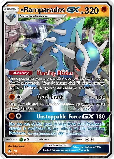 Once per turn, you may attach 3 energy from your deck. Shuffle afterwards. Your Pokémon deal 70 more damage and take 50 less damage for each energy attached.Head Crash • 180