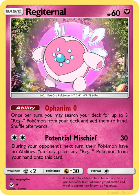 Once per turn, you may search your deck for up to 3 "Regi-" Pokémon from your deck and add them to hand. Shuffle afterwards.Potential Mischief • 30