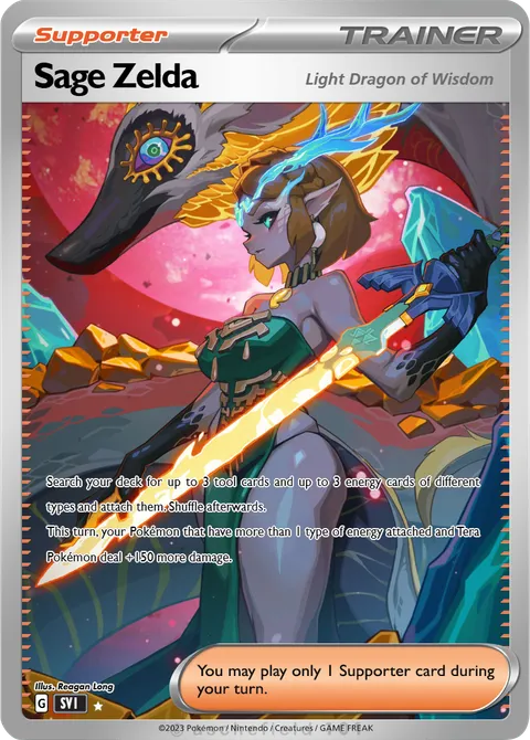 Search your deck for up to 3 tool cards and up to 3 energy cards of different types and attach them. Shuffle afterwards. This turn, your Pokémon that have more than 1 type of energy attached and Tera Pokémon deal +150 more damage.