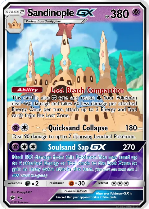 This card is also F type and resists W. Your Pokémon deal +60 damage and takes 60 less damage per attached Energy. Once per turn, attach up to 2 Energy and Tool cards from the Lost Zone.Quicksand Collapse • 180