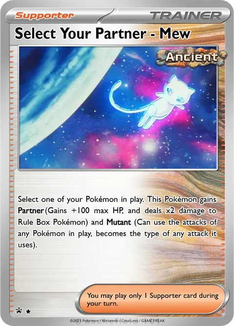 Select one of your Pokémon in play. This Pokémon gains Partner(Gains +100 max HP, and deals x2 damage to Rule Box Pokémon) and Mutant (Can use the attacks of any Pokémon in play, becomes the type of any attack it uses).