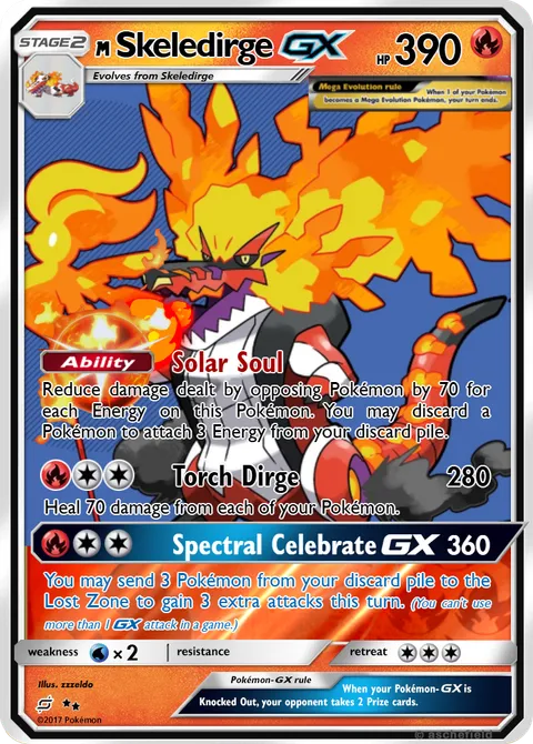 Reduce damage dealt by opposing Pokémon by 70 for each Energy on this Pokémon. You may discard a Pokémon to attach 3 Energy from your discard pile.Torch Dirge • 280
