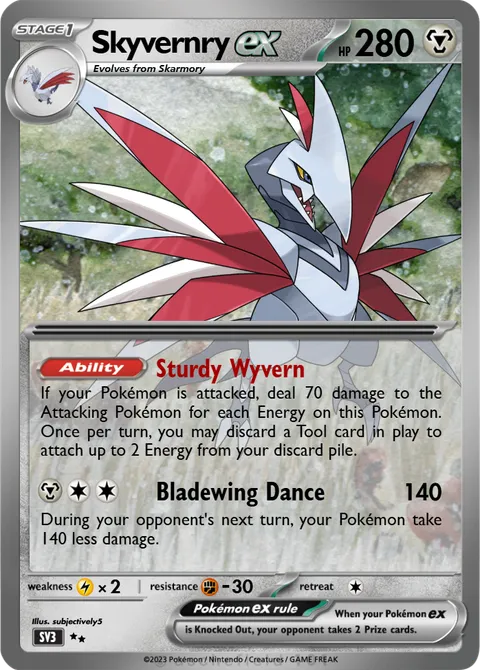If your Pokémon is attacked, deal 70 damage to the Attacking Pokémon for each Energy on this Pokémon. Once per turn, you may discard a Tool card in play to attach up to 2 Energy from your discard pile.Bladewing Dance • 140