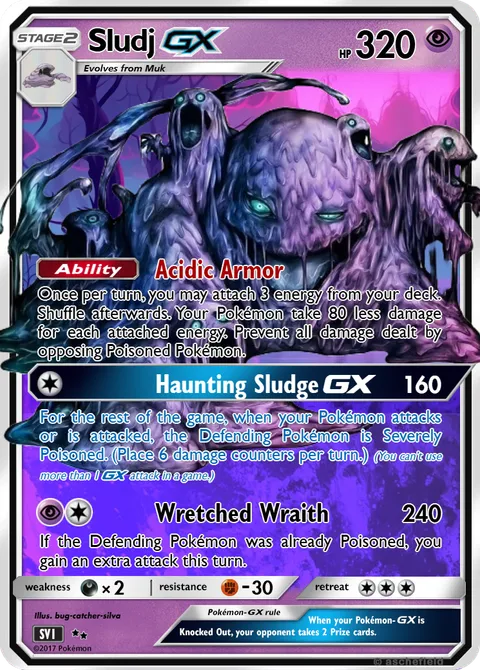 Once per turn, you may attach 3 energy from your deck. Shuffle afterwards. Your Pokémon take 80 less damage for each attached energy. Prevent all damage dealt by opposing Poisoned Pokémon.Haunting Sludge • 160