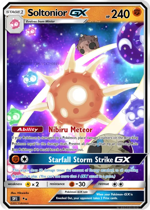 If your Pokémon is damaged by a Pokémon, place damage counters on the Attacking Pokémon equal to the damage dealt. Prevent all damage dealt by an opposing Rule Box Pokémon if it would knock a Pokémon out.Starfall Storm Strike
